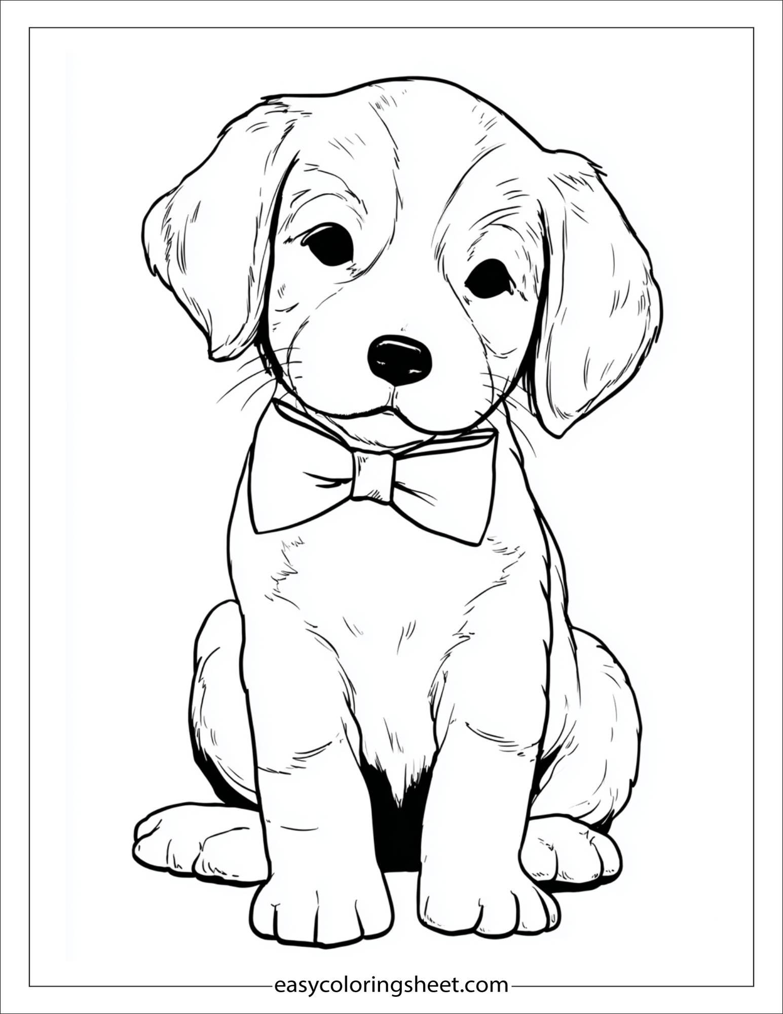 This picture shows a cute puppy wearing a bowtie. The puppy looks calm and smart, sitting nicely and looking forward. Its bowtie makes it look fancy and ready for a special day. Kids will have fun coloring this adorable page. Use light brown, golden, or cream for the puppy’s fur, and black for the nose and eyes. The bowtie can be red, blue, or purple to make it stand out. The background can be light yellow or sky blue. This sweet picture is perfect for easycoloringsheet.com.