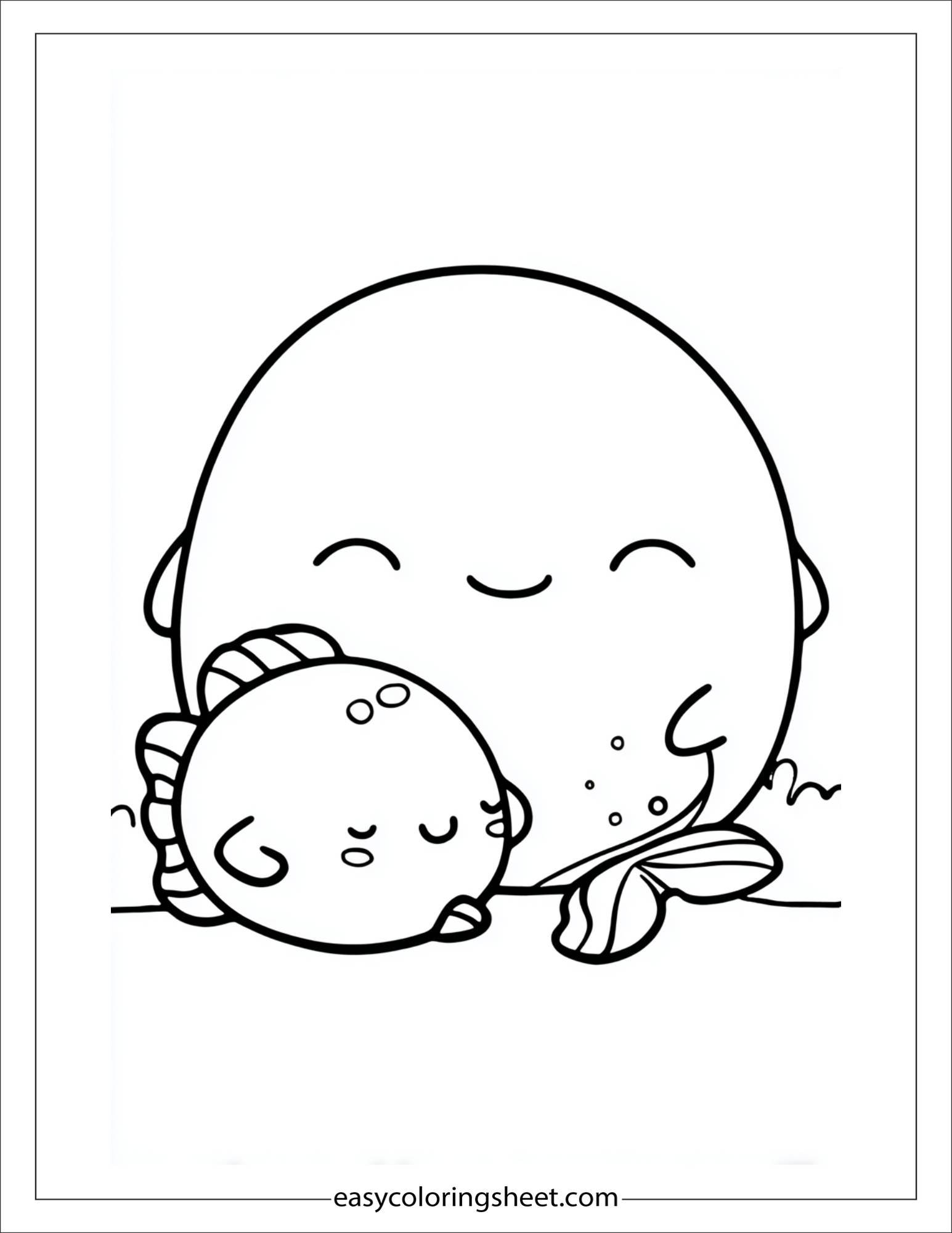 This picture shows a cute Squishmallow cuddling a small mermaid Squishmallow. They both look calm and happy with their eyes closed. The mermaid has a little tail and fins. Kids can color the big Squishmallow in soft colors like pink, yellow, or blue. The mermaid can have bright colors like purple, teal, or green for the tail and fins. Their cheeks can be soft pink. This coloring page is simple and sweet for young children. It helps them practice neat coloring and enjoy using soft and bright colors together.